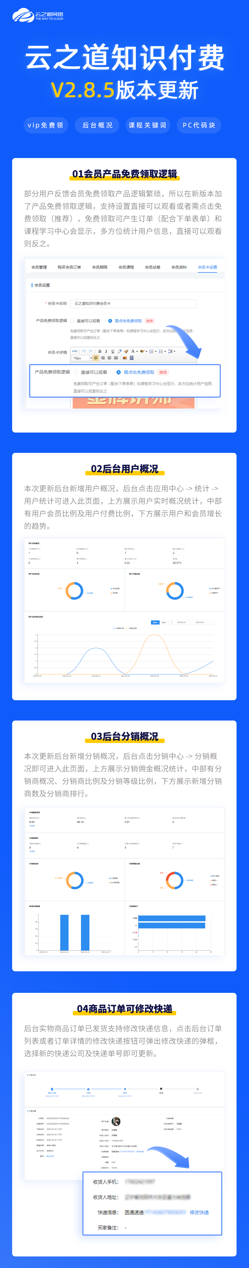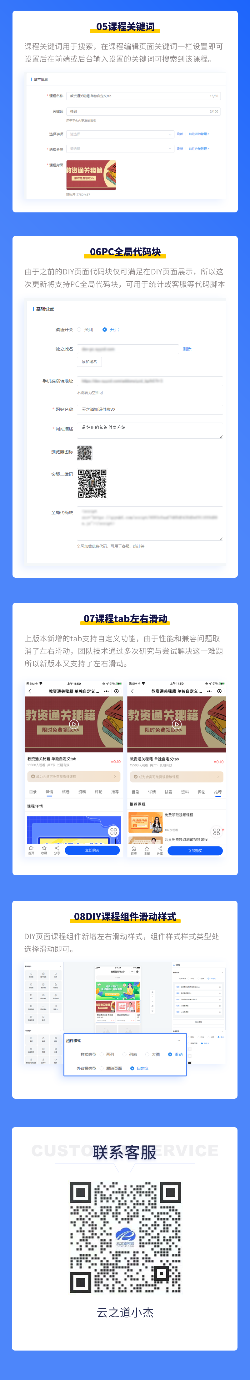 【更新】会员产品免费领取逻辑、用户概况、分销概况、课程关键词、PC全局代码块、课程TAB左右滑动、DIY页面课程组件滑动样式..